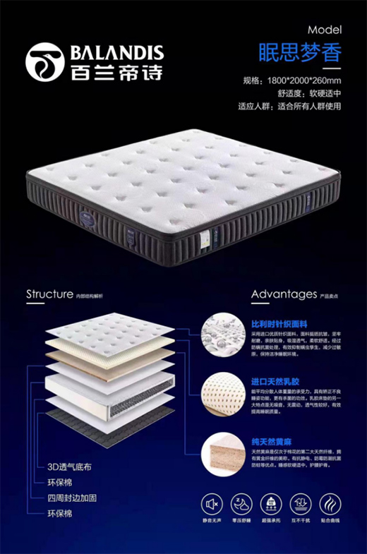 百蘭帝詩家居是一個極具創(chuàng)造力和創(chuàng)新能力的企業(yè),創(chuàng)新是深入骨髓的企業(yè)基因,每一個百蘭帝詩人都有非常強的創(chuàng)造力和創(chuàng)新力。百蘭帝詩人非常注重產(chǎn)品的設(shè)計風格、款式及品牌的獨特性,融合古典與前衛(wèi)、現(xiàn)代與時尚、生活與情趣,旨在用全新的設(shè)計思維和以人為本的理念去打造生活的藝術(shù)。2022年,百蘭帝詩家居推出的眠思夢鄉(xiāng)系列,就是針對深睡眠的5大維度優(yōu)勢(貼合感、接觸柔軟感、適溫感、干爽感、安全感),精選比利時針織面料、進口天然乳膠、純天然黃麻等原材料制作形成全方位的零感深睡體驗,倡導(dǎo)人們回歸睡眠本質(zhì),讓身體得到大滿足。