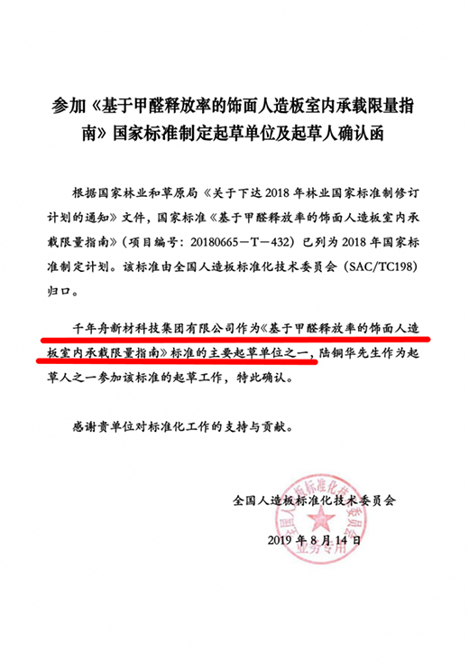 在2018年,千年舟就成功研發(fā)生產(chǎn)出企業(yè)標準無醛級板材——天然豆香生態(tài)板,板材甲醛釋放量≤0.018mg/m3,也就是說,這個數(shù)據(jù)優(yōu)于新國標ENF級(≤0.025mg/m3)