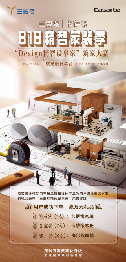 為了廣泛發(fā)掘更有潛力的設(shè)計(jì)師,為他們提供一個(gè)展露風(fēng)采的平臺(tái)。8月1日,三翼鳥聯(lián)合設(shè)計(jì)工作室、家裝公司等共同發(fā)起三翼鳥|卡薩帝818精智家裝季#Design精智設(shè)享家#筑家大賽,開啟“設(shè)計(jì)師合伙人”招募。