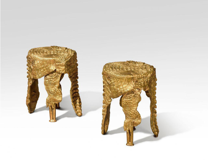 在為保琳量身打造的眾多作品中,最為獨特的莫過于克洛德所創(chuàng)作的《鱷魚凳》(Crocodile Stools,估價:18萬至25萬英鎊)——這是在市場上前所未見的款式。《鱷魚》系列的誕生與作品本身一樣充滿超現(xiàn)實色彩。1972年的一個滿月之夜,得力于藝術(shù)家妮基?桑?法勒(Niki de Saint Phalle)與動物園園長的關(guān)系,萊蘭在午夜前往當(dāng)?shù)貏游飯@,取得一只剛死的鱷魚。