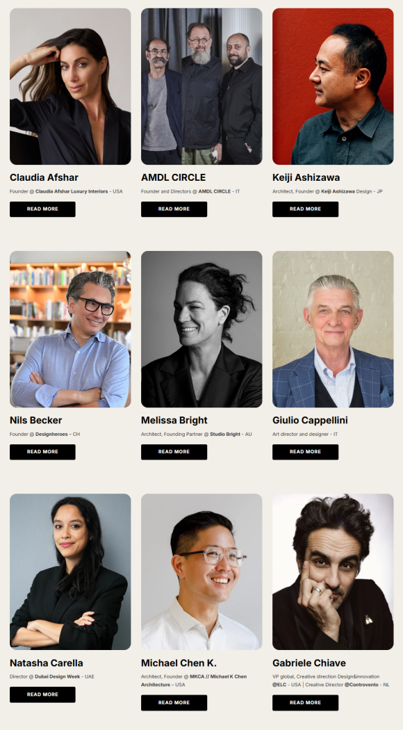 本屆賽事評(píng)審團(tuán)堪稱"設(shè)計(jì)界的全明星陣容",匯聚43位全球創(chuàng)意領(lǐng)袖。涵蓋建筑、室內(nèi)、藝術(shù)與可持續(xù)發(fā)展領(lǐng)域。國(guó)際評(píng)委包括(列舉部分):