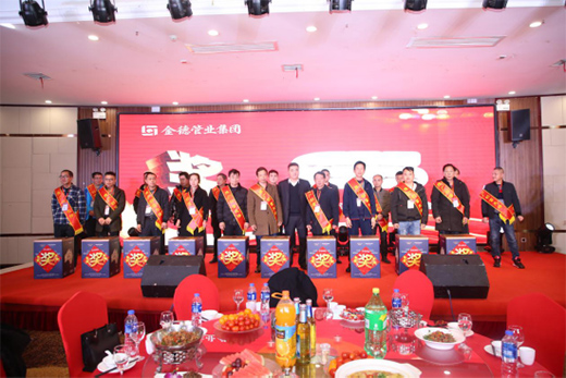 燈光璀璨的夜晚,感恩晚宴正式開始。為感恩經(jīng)銷商、水電工一直以來對金德管業(yè)的支持,晚宴上還設(shè)置了莊重且溫馨的頒獎(jiǎng)環(huán)節(jié),特別以豪華大禮及歡呼掌聲向拼搏在市場前線、服務(wù)前線的優(yōu)秀經(jīng)銷商、水電工致以崇高的敬意。