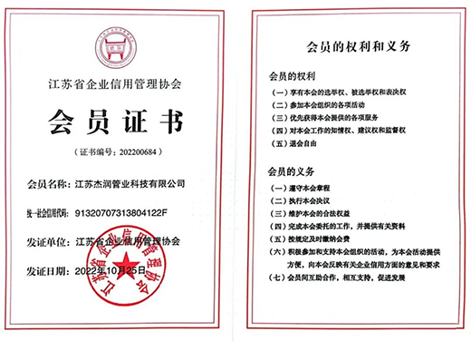 近日,江蘇杰潤管業(yè)科技有限公司獲評江蘇省“守合同重信用”企業(yè),江蘇省“守合同重信用”企業(yè)是經(jīng)廣泛推薦、嚴(yán)格審核、實地考察、網(wǎng)絡(luò)評議、專家評審,并經(jīng)江蘇省企業(yè)信用管理協(xié)會審定。