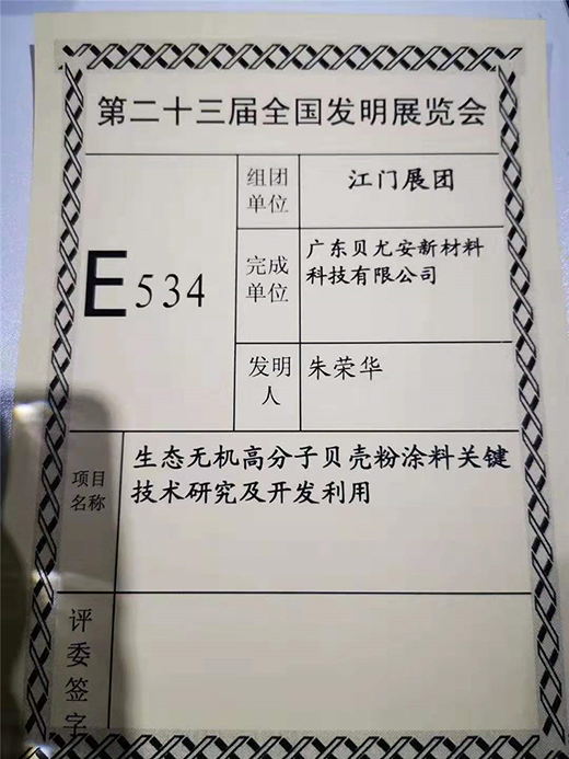 貝尤安貝殼粉涂料獲第二十三屆全國發(fā)明展覽會金獎