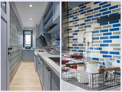 廚房打掉原始的墻體,做成一排排玻璃磚,加大了廚房的通透感與采光效果。藍(lán)與灰白的馬賽克瓷磚墻面,有效的增加了空間的層次感。