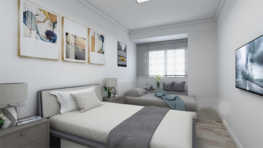 臥室的設計首選要滿足人們居住的舒適和隱秘性,純色貝殼粉涂料墻面的搭配使用,為居住營造了更加健康的休憩空間,簡約而不簡單。