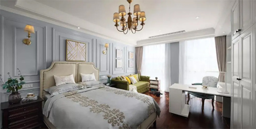 沙發(fā)背景墻也同樣選用淡藍(lán)色,和床頭背景墻形成通透視覺(jué)效果,沙發(fā)背景墻同樣采用一樣的美式風(fēng)格的線(xiàn)條來(lái)裝飾,空間既不會(huì)顯得局促,同時(shí)也可以很好的區(qū)分功能區(qū)。