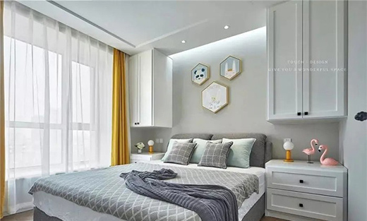 清新淡雅的綠色系搭配在一起雖然很漂亮,但是如果每一個(gè)房間都選用這樣的色彩當(dāng)然也是不行的,這樣很容易產(chǎn)生視覺(jué)疲勞,所以主臥室選用淡灰色來(lái)進(jìn)行色彩中和。走到臥室看到淡灰色的背景墻,讓人們感覺(jué)煥然一新,從跳躍活潑的色彩世界來(lái)到淡雅的空間,讓人感覺(jué)很安定很踏實(shí)。