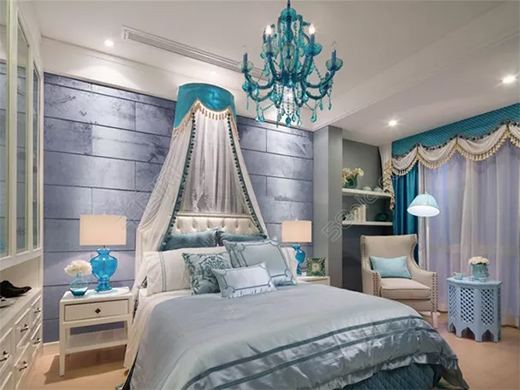 地中海風格的裝修在選色上,取材于大自然的色彩,來體現(xiàn)向往自然,親近自然、感受自然的生活情趣。燈具、花瓶、床簾、床單等從深到淺地詮釋了海洋不同的藍色。潔白的家居和床簾窗簾與藍色互相映襯,仿佛白色的沙灘、村莊在碧海藍天下閃閃發(fā)光。墻面是代表神秘優(yōu)雅的紫色,取材于薰衣草飄來的藍紫色香氣。地中海風格對中國城市家居的最大魅力,就是來自其純美的色彩組合。