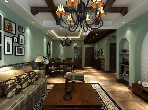 美式田園風格就是要接近自然。客廳墻面整體采用綠色,綠化植物散布在地面、茶幾、裝飾柜等處,形成錯落有致的格局和層次,能充分體現(xiàn)人與自然的完美和諧的交流??蛷d和餐廳沒有隔斷,而是開放式的空間,顯得寬敞而大氣。深色的家具、仿古的地磚有著簡化的線條和粗獷的體積,給人質樸的親切感。