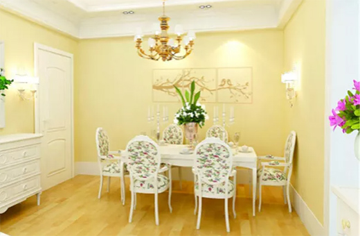 墻面總體是淡黃色,在家居裝飾中能夠輕而易舉地營造出溫馨和諧的氣氛。門、儲物柜、餐桌和椅子都是以白色為主,優(yōu)雅的造型,細致的線條和高檔油漆處理,都使得每一件產品都顯得含蓄溫婉從容淡雅。而椅子坐墊和靠背上唯美的小碎花幾乎是英式田園風格的代名詞,給人以清新與平和之感。