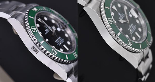 腕表另一側(cè)設(shè)有旋入式表冠,頂部鐫刻有勞力士標(biāo)志皇冠標(biāo)識,下方的三個點則代表為表冠具備三扣鎖三重防水系統(tǒng),表冠設(shè)有防滑坑紋設(shè)計以便佩戴者方便調(diào)節(jié)。表冠牢固旋緊于表殼使得腕表防水性能可深達300米。表殼這一側(cè)的改動在于表冠護肩,勞力士將新款的護肩調(diào)整至更加窄細了一些,這點我們可以從對比圖上看出來,但也確實不是很明顯。