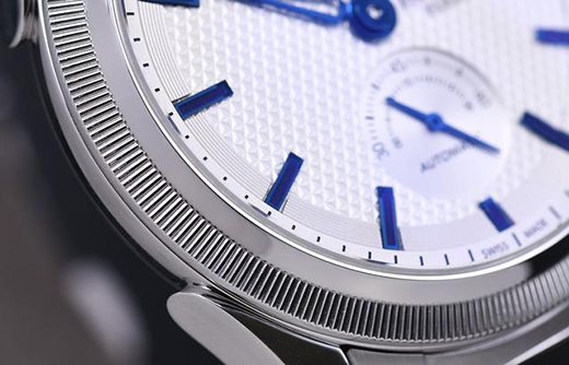 表盤6點(diǎn)位置處則設(shè)立了精巧的小秒盤,小秒盤上設(shè)有獨(dú)特的雙面指針,短邊指示0-30秒,長(zhǎng)邊指示30-60秒,設(shè)計(jì)巧妙。盤面12點(diǎn)位置下則設(shè)立了清晰明了的大日歷顯示視窗,便于佩戴者快速讀取盤面信息。