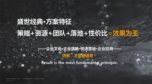 盛世經(jīng)典,專業(yè)品牌營銷策劃機(jī)構(gòu)。100+成功案例,專門解決企業(yè)文化落地問題。在理解和了解企業(yè)的基礎(chǔ)上,盛世經(jīng)典會因地制宜地制定整體方案,提升方案的有效性和落地性。我們拒絕創(chuàng)意自嗨,相信“效果才是硬道理”。所有的工作,都聚焦于一個(gè)點(diǎn)——落地,助力企業(yè)迅速招商,實(shí)現(xiàn)業(yè)績倍增!