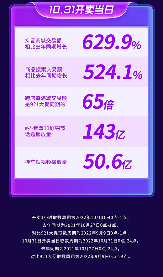 從貨架場景、內容場景到支付端財經玩法,抖音電商全域玩法全面開啟,截至10月31日24時,抖音商城交易額相比去年同期增長629.9% ;#抖音雙11好物節(jié) 話題播放量達143億。