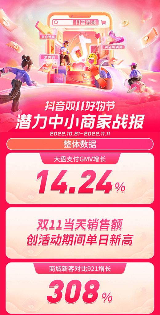 雙11期間,潛力中小商家大盤(pán)支付GMV增長(zhǎng)14.24%,雙11當(dāng)天銷(xiāo)售額創(chuàng)活動(dòng)期間單日新高,商城新客對(duì)比921增長(zhǎng)308%。