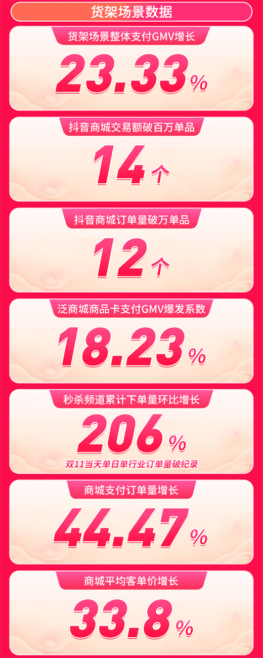 貨架場(chǎng)景下,整體交易額趨好,破百萬(wàn)爆品涌現(xiàn),商品卡、秒殺頻道釋放出交易拉動(dòng)力:貨架場(chǎng)景整體支付GMV增長(zhǎng)23.33%;抖音商城交易額破百萬(wàn)單品14個(gè),訂單量破萬(wàn)單品12個(gè);泛商城商品卡支付GMV爆發(fā)系數(shù)18.23%,秒殺頻道累計(jì)下單量環(huán)比增長(zhǎng)206%。