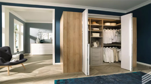 老年人行動(dòng)逐漸不便,居家生活中要十分注意防止摔跤和二次傷害,在此方面我們建議采用無下軌的折門設(shè)計(jì)。例如,無需下部導(dǎo)向折門系統(tǒng),充分利用空間的無障礙設(shè)計(jì)。