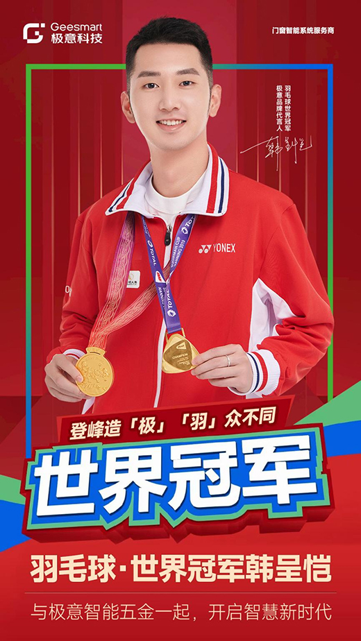 冠軍品質(zhì),冠軍代言!極意科技正式簽約羽毛球世界冠軍韓呈愷成為其品牌代言人。冠軍的加盟將給品牌的發(fā)展與布局注入全新力量,為極意智能五金系統(tǒng)品牌建設(shè)硬核賦能。