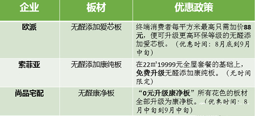除了歐派、索菲亞、尚品宅配推出優(yōu)惠政策外,鳳凰家居也從多方渠道了解到,維意家居、好客萊也推出一系列“免費(fèi)升級(jí)無醛板材”優(yōu)惠活動(dòng)。