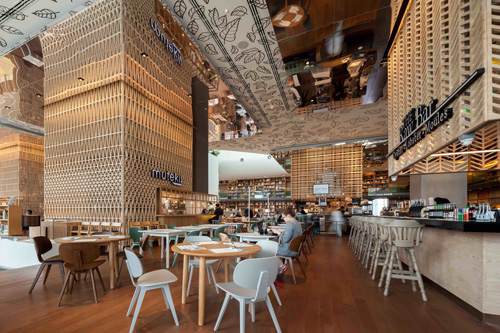 為了使這個(gè)空間易于通行,設(shè)計(jì)師為每一個(gè)空間的餐館開發(fā)了一系列的塔。這些塔樓能像“圖騰”一樣運(yùn)作,從遠(yuǎn)處可以清晰地看到餐廳,同時(shí)隱藏著凌亂的廚房和通風(fēng)管道。每座塔都鑲嵌著獨(dú)特的木材拼接圖案,反射在每個(gè)塔樓天花板周圍的鏡面板上。