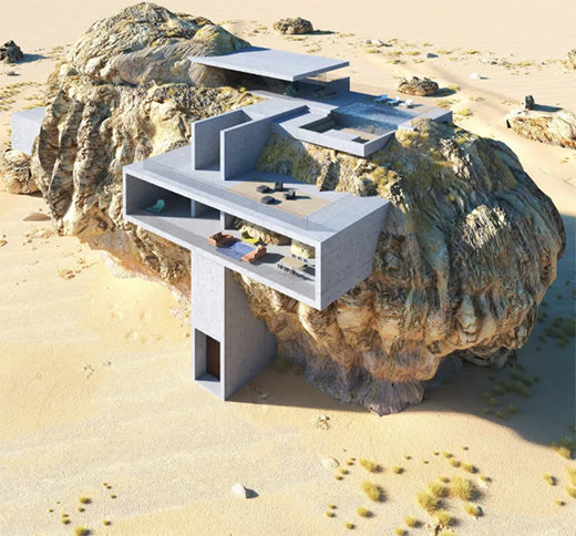 由視覺藝術(shù)家所做的這一系列渲染圖,描繪了一個(gè)看上去似乎是生長在一塊巨石當(dāng)中的豪宅。這一套圖有著超越現(xiàn)實(shí)的美感,突破了自然與設(shè)計(jì)的邊界,將它們完美地融合在了一起。
