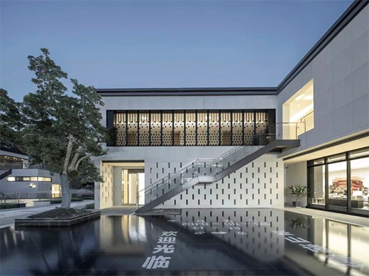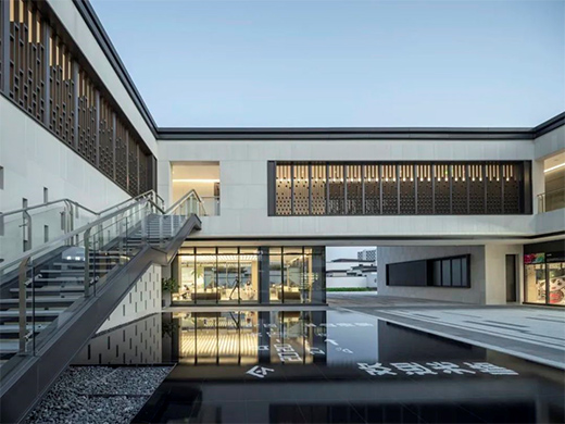 太古則沉悶,太新則無(wú)趣,建筑形式如何在中式與現(xiàn)代之間取得平衡,是立面設(shè)計(jì)的難點(diǎn)。我們將中國(guó)傳統(tǒng)的人字坡屋頂進(jìn)行裁剪,形成具有現(xiàn)代審美特征的非對(duì)稱(chēng)單坡曲面,同時(shí)所有屋頂曲面向內(nèi)呼應(yīng)“四水歸堂”格局,外側(cè)是干凈的現(xiàn)代立面,內(nèi)側(cè)帶有坡屋頂?shù)闹惺巾嵨?。同時(shí)采用金屬屋面,定制鋁合金格柵,仿石磚,玻璃磚等現(xiàn)代的材料組合,形成中式與現(xiàn)代交融的形式語(yǔ)言。