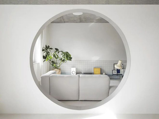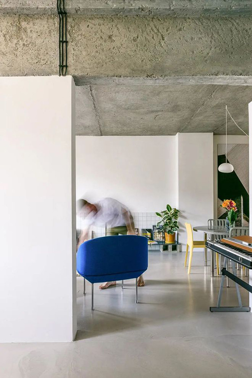 公共空間和半開放式廚房之間留有圓形門洞,起居室下方是一個由廢混凝土塊和藍(lán)色玻璃制成的架子。