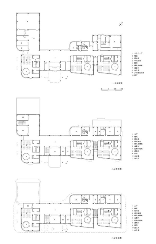 最后,建筑在屋面增加懸挑的整體屋檐造型,來統(tǒng)一各部分單元體量,強(qiáng)化建筑的整體聯(lián)系。水平的屋頂天際線在老城區(qū)中與周邊復(fù)雜的建筑界面對(duì)比,展現(xiàn)了更加清晰的形體關(guān)系,屋面在活動(dòng)單元處進(jìn)行了圓形天窗設(shè)置,豐富了建筑屋面層次。