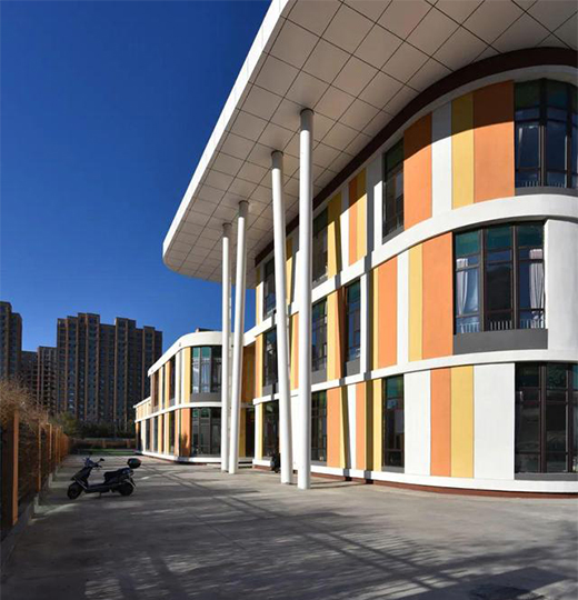 隨后設(shè)計(jì)通過紅黃橙白的色彩引入,通過色彩拼貼的方式,來大膽的活化建筑表皮界面,展現(xiàn)了幼兒園建筑的兒童情趣特色。暖色系的使用符合北方建筑的冬季視覺需求,也是對(duì)基地周邊城市建筑色彩的呼應(yīng),暖色色彩拼貼使幼兒園建筑既融入烏蘭浩特城市環(huán)境,也適當(dāng)?shù)耐癸@了建筑的自身視覺特征。