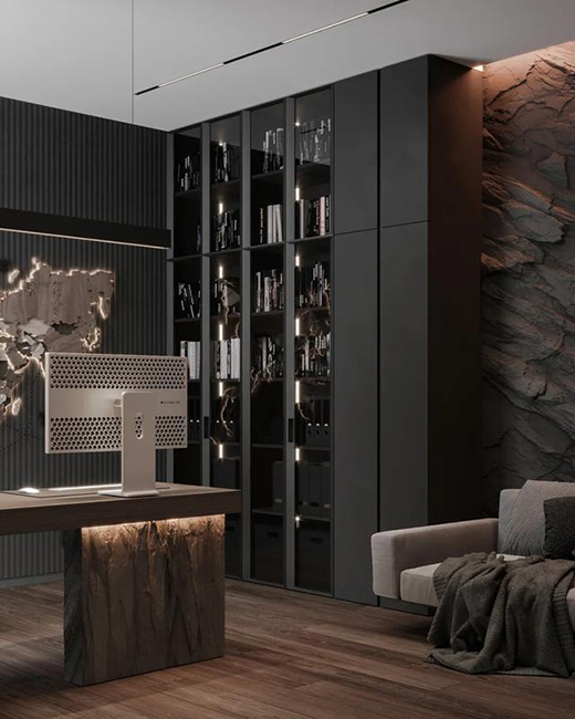 家庭辦公室沿用了客餐廳的色調(diào)和材質(zhì),在靜謐的空間里,一眼便捕捉到了墻面的世界地圖,頗具創(chuàng)意感。粗礦的石材在整體空間中彰顯更深層次的藝術效果。