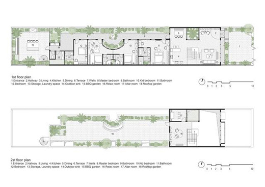 建筑外觀以鏤空圍墻、立面筑起兩層屏蔽,減少直曬過熱日光之余,也完善提升隱現(xiàn)自如的隱私,并且將整座量體稍加退縮,以宅院做為前景的布局手法,褪去嘈雜噪音與灰塵仆仆的不良體質(zhì)。
