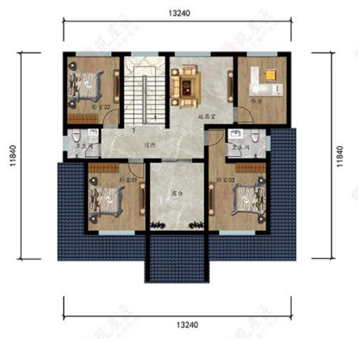 二層主要是休息區(qū),規(guī)劃了3個臥室、書房、起居廳和大露臺,主臥套間滿足現(xiàn)代品質(zhì)生活,其他功能區(qū)滿足人們的學習娛樂需求,非常舒適。