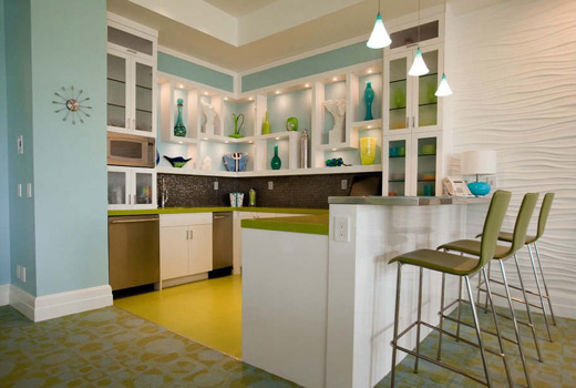 大大的空間中廚房空間就是整套的櫥柜所在地,黑白兩色的經(jīng)典搭配很好的和周圍的墻面色彩相一致,另外下方的復古色地板也是很不錯的點綴。開放的樣式保證了其充足的操作空間。