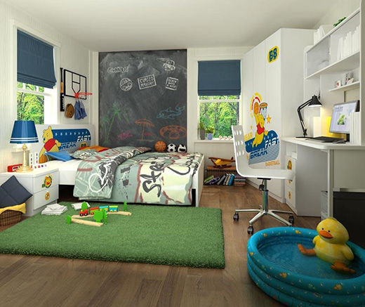 兒童房的家具尺寸不宜過(guò)大,拐角應(yīng)為圓角,以防孩子磕碰。床可設(shè)計(jì)成單層,也可設(shè)計(jì)成高床,用小扶梯上下,高床兩側(cè)要加護(hù)板,以防墜落,床的一側(cè)應(yīng)靠墻。