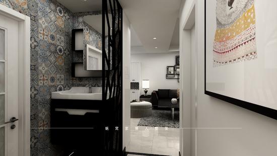 洗手間色調(diào)以黑白顏色為主,傾向北歐極簡(jiǎn)風(fēng),搭配花紋背景墻,適當(dāng)添加小配件讓整體視覺效果更豐富。