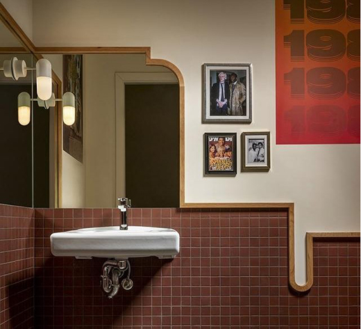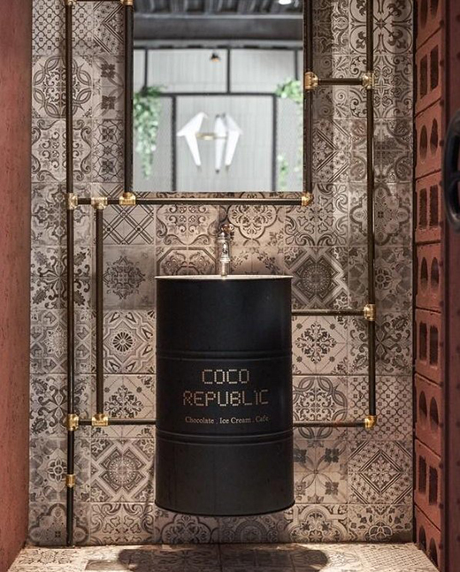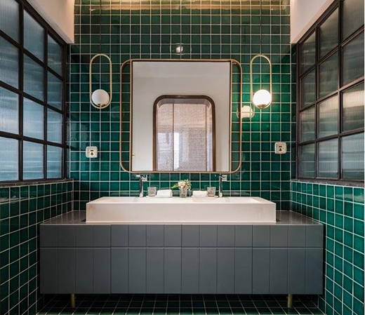 彩色的瓷磚自然也不少見,尤其是一些灰色調(diào)的瓷磚,能夠帶來濃濃的復(fù)古風(fēng)情。鏡子角上曲線的收邊,墻上貼著的復(fù)古海報(bào),老式的臺(tái)盆式樣,仿佛時(shí)光倒流回了上個(gè)世紀(jì),但各個(gè)細(xì)節(jié)上又更加的精致和講究。