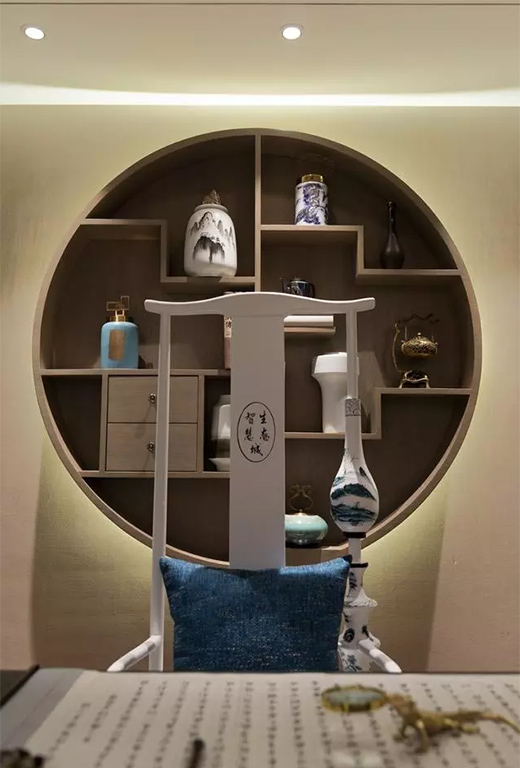 藍黑水墨渲染的地毯,給書房空間增添幾許靜謐的氛圍,于書卷文物中品味禪意和淡然。窗簾運用傳統(tǒng)山水圖案掛簾,呼應主題,作為室內(nèi)外空間的一個延伸。圓形實木置物區(qū)鑲嵌于背景墻面,若即若離,間隙中透出光暈,有日出日落的寓意。文物古董的收藏擺放有序,透露出主人深厚的文化修養(yǎng)。