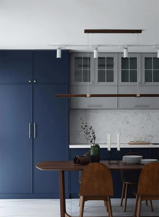 ▲ 冷色調(diào)的空間,通過溫潤的木質(zhì)餐桌椅來中和,灰色玻璃吊柜用于藏酒