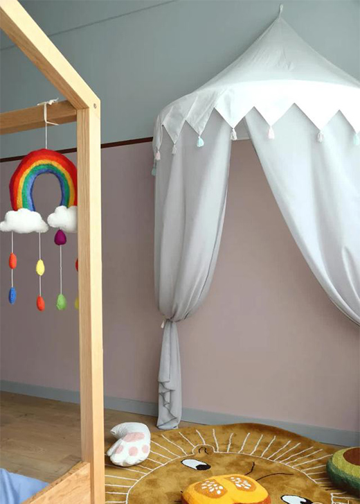 ▲ 角落用一頂白色蚊帳、黃色圓形獅子地毯以及周邊卡通形象抱枕,為妹妹打造了一個美麗的童話世界