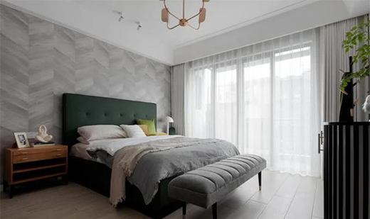 ▲ 主臥與鄰居的共用墻,采用多重保險(xiǎn)的隔音處理,木地板搭配魚骨拼圖案的灰色壁紙,復(fù)古綠大床與玫瑰金主燈呈現(xiàn)復(fù)古精致的格調(diào)
