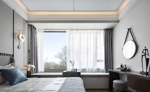 其中一間臥室的裝修效果,和客廳的配色設(shè)計保持一致,配色素雅但格調(diào)優(yōu)雅。長長的飄窗沒有過多設(shè)計,配上灰色的飄窗墊,再掛上灰色的窗簾,營造出的睡眠環(huán)境特別溫馨。