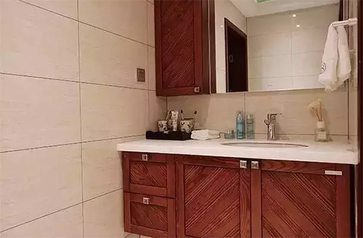 衛(wèi)生間增加了一組吊柜,方便收納物品,柜門選用斜紋突出現(xiàn)代感。