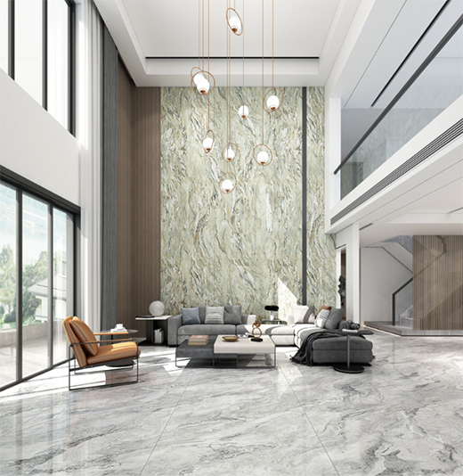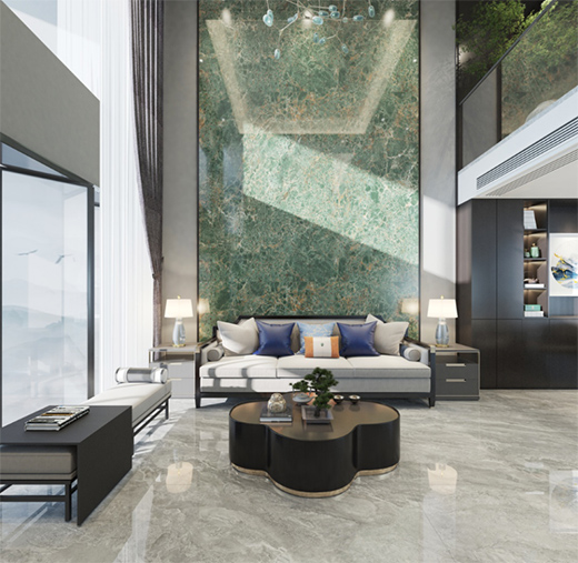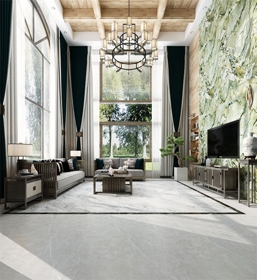 綠色系巖板大面積應用在歐式風格客廳的地面,能代替綠植在空間的作用,讓空間顯得清新自然。綠白色系的搭配,營造出森林深處的靜謐祥和。