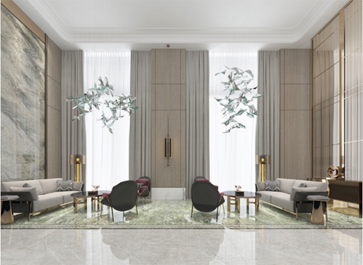 作為搶眼的個性色,綠色也可以大范圍應用,比如在高端商業(yè)酒店里,選擇在空間的主視覺范圍鋪滿綠色巖板,讓人如同行走在郁郁蔥蔥的森林中,更寓意酒店的生意勃勃生機、蓬勃發(fā)展。