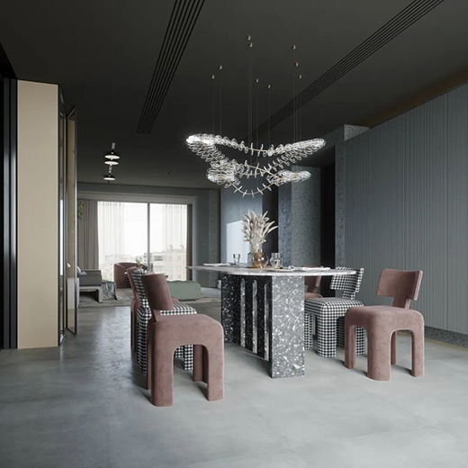 ▲廚房設(shè)計小巧精致,延續(xù)高級灰的基調(diào),將所有視覺重點放在了餐桌及餐椅上,大理石的餐桌搭配設(shè)計感極強的絨布餐椅,凸顯生活品質(zhì),借助餐椅仿生的簡約趣味造型,以及精心搭配的線性燈飾,打破空間的穩(wěn)重感,打造溫馨愜意的就餐氛圍。