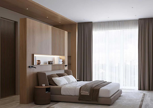 主臥同樣以木色為主,灰色和白色營(yíng)造出溫暖而私密的氛圍。