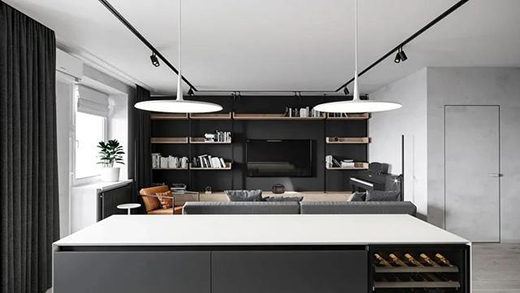 廚房位于客廳的后方,黑白色的臺(tái)式中島雙層設(shè)計(jì),上方的白色吊燈又突出了整個(gè)空間的藝術(shù)氛圍,雅黑色的櫥柜在空間中進(jìn)行相互融合,讓整個(gè)空間的層次氛圍越來越豐富。
