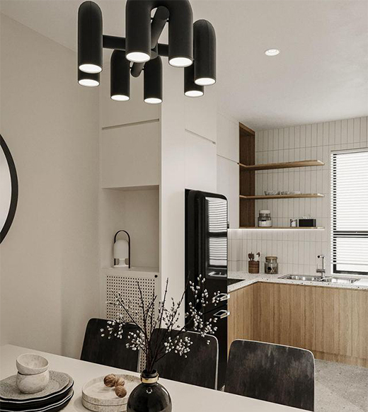 餐廳與L形廚房相連,天然木材和干凈的白色櫥柜帶來低調、雅致的美感。