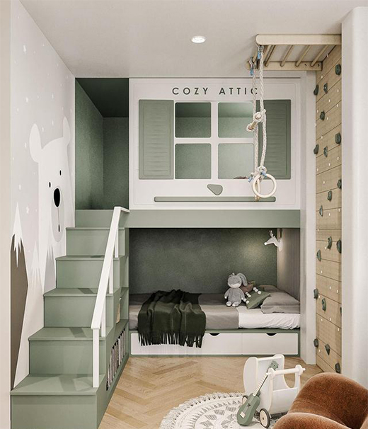 臥室是孩子們夢寐以求的空間,可愛的壁畫引導通往床上方舒適的游戲閣樓。